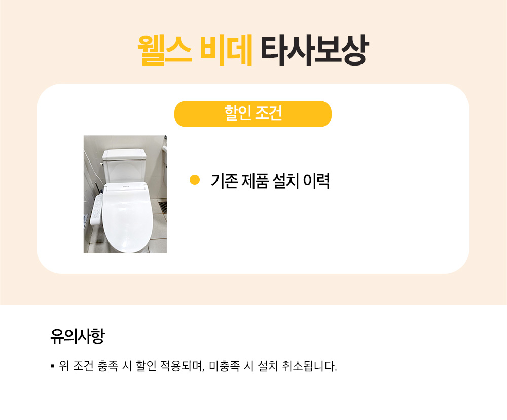 | 비고 | ① 설치후 고객센터에 통합결제 요청 시 제휴카드 한장으로 총 결제금액에서 할인됨. - 2,3 종 패키지인 경우 결제정보는 한가지만 등록 가능함. ② 타사보상으로 신청시 기존 웰스 사용자는 폐가전 수거요청 불가 ■ 설치시 비용 [기본설치비 면제이나 현장상황에따라 다름] - 천연 대리석 타공시 1회에 한해 비용은 없으나 복구는 불가 - 인덕션 외함 무상 ■ 동일 품목 다른 채널로 가입 이력 있는경우 온라인 채널에서 진행 불가 ex) 방문판매로 정수기 사용중인 고객은 온라인 채널에서 정수기 가입이 불가 ■ 안마의자 설치시 - 엘레베이터 있을경우, 바로설치진행 - 엘레베이터 없을경우, 4층까지는 계단으로 이동, 5층이상부터는 현장에서 엔지니어가 사다리차 섭외 (단, 사다리차 비용은 고객부담) ■ 데스크탑중 배수필요없는모델 - WP610 / WQ171 / WQ672 (온라인전용) ■ 수압낮을때 -펌프추가설치비용 - 직수형은 105,000원(분납시 렌탈요금 月2,000원 추가) - 저장형은 87,000원(분납시 렌탈요금 月1,700원 추가) |
